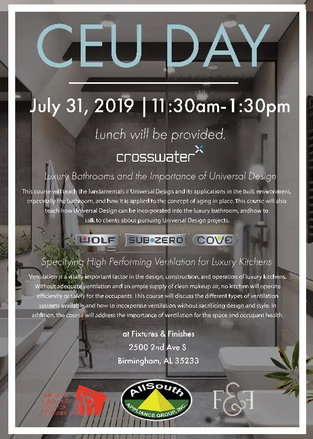 Join AllSouth Appliance at Fixtures & Finishes on July 31st from 11:30am- 1:30pm for a Continuing Education opportunity! Crosswater and SubZero Wolf will be presenting CEU Courses for those interested. […]