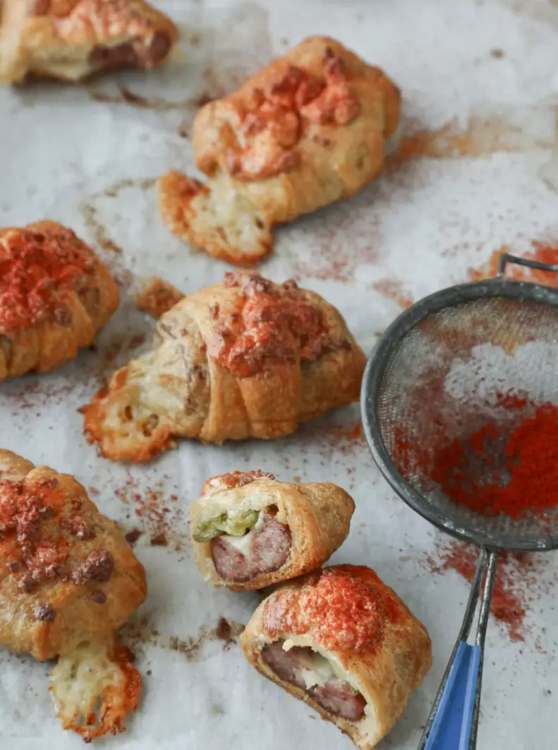 - Remove the rolls from the tube and separate into triangles. Place 1 piece of sausage lengthwise on the wide end of each piece of dough. Fold the ends toward the center, burrito style, and roll to completely cover the sausage. Pinch the edges of the dough closed. Place on the baking sheet, brush each roll with the garlic butter, and sprinkle with the cotija. You’ll need to press the cheese into the dough using your fingers.